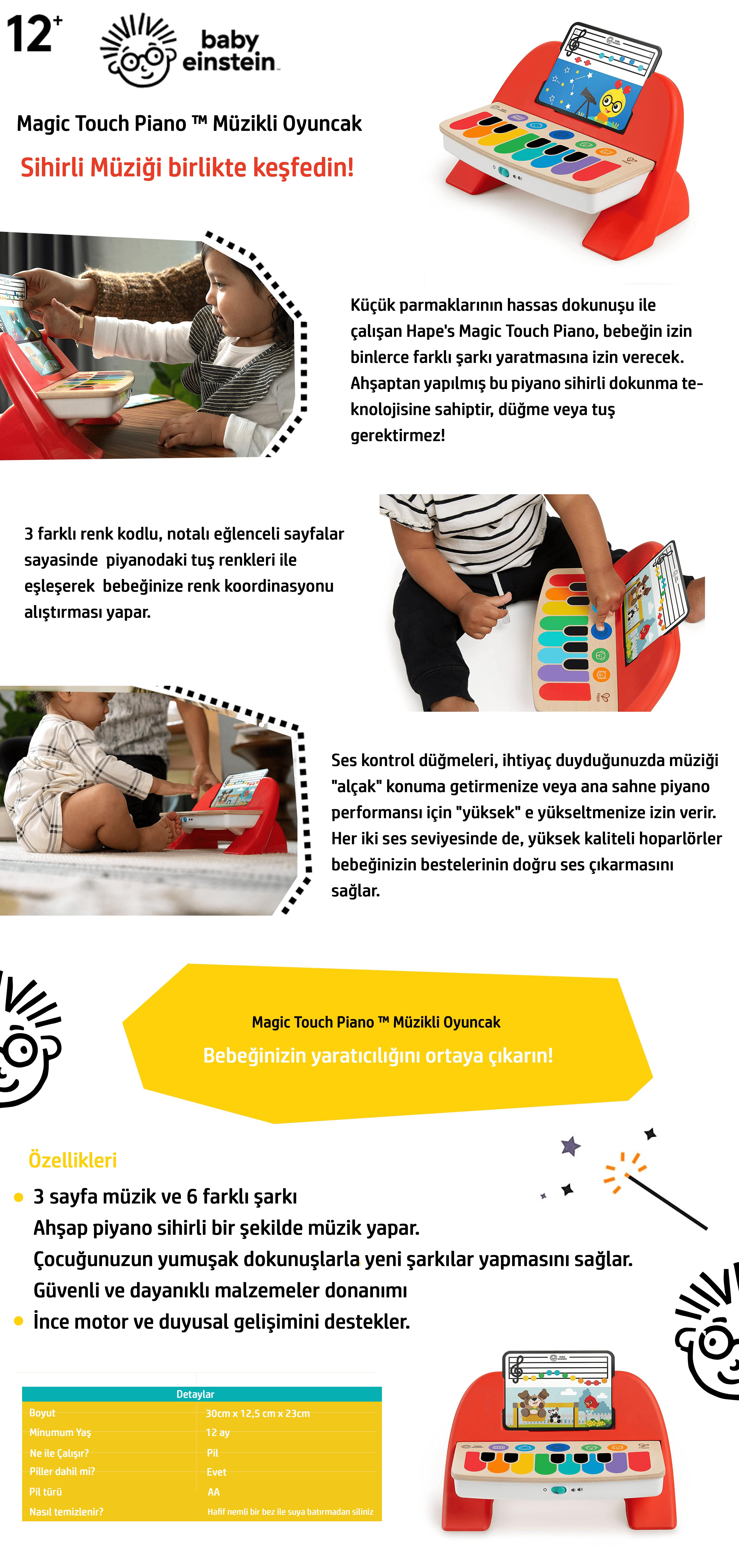 Küçük parmaklarının hassas dokunuşu ile çalışan Hape's Magic Touch Piano, bebeğin izin binlerce farklı şarkı yaratmasına izin verecek. Ahşaptan yapılmış bu piyano sihirli dokunma teknolojisine sahiptir, düğme veya tuş gerektirmez!