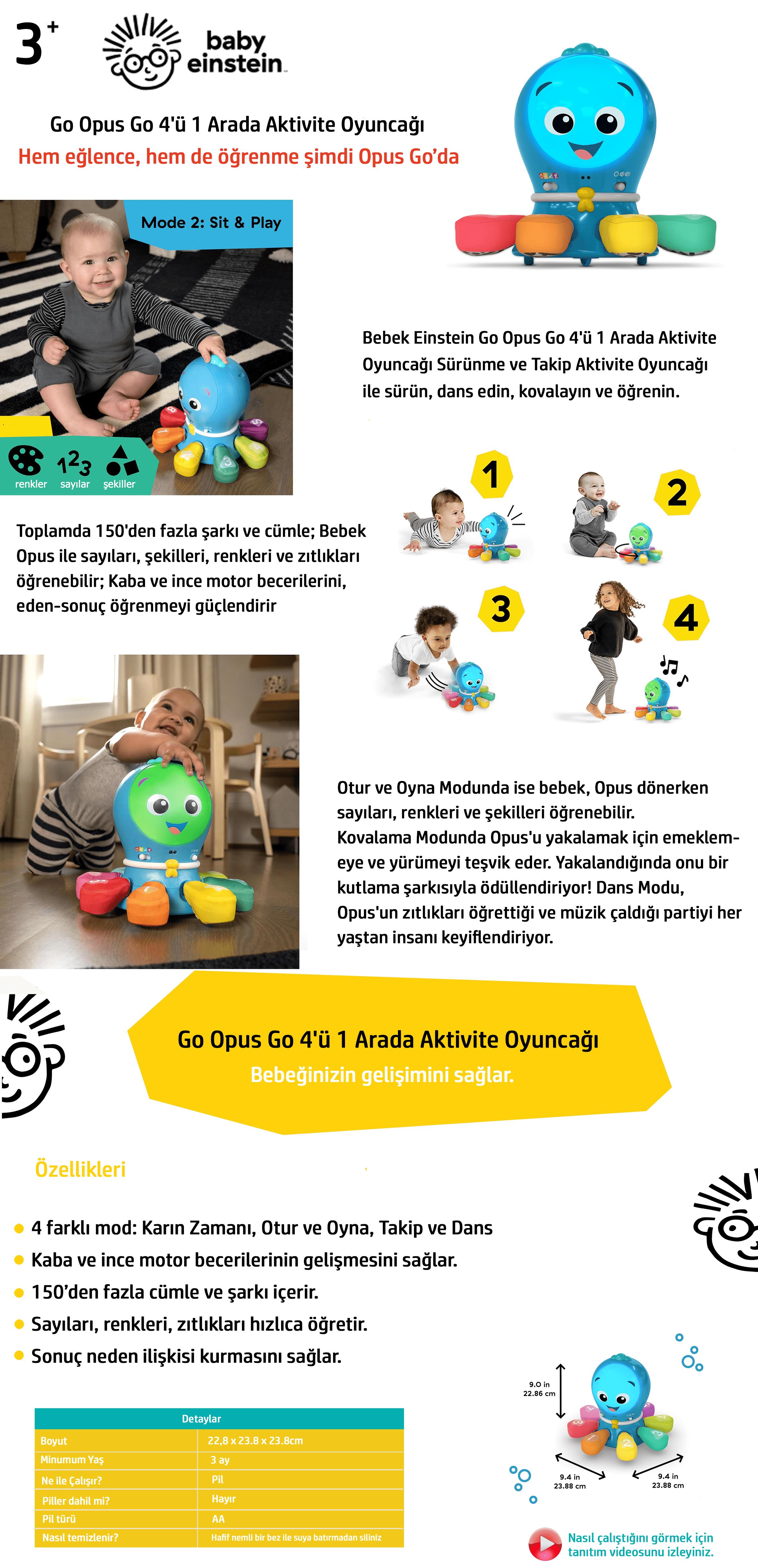Go Opus Go 4'ü 1 Arada Aktivite Oyuncağının 4 modu bulunur: Karın Zamanı, Otur ve Oyna, Takip ve Dans; Bebeklikten okul öncesi döneme kadar bebeğin fiziksel ve bilişsel ihtiyaçlarıyla birlikte büyür. Sekiz peluş kol bebeğin en ufak dokunuşuna tepki verir