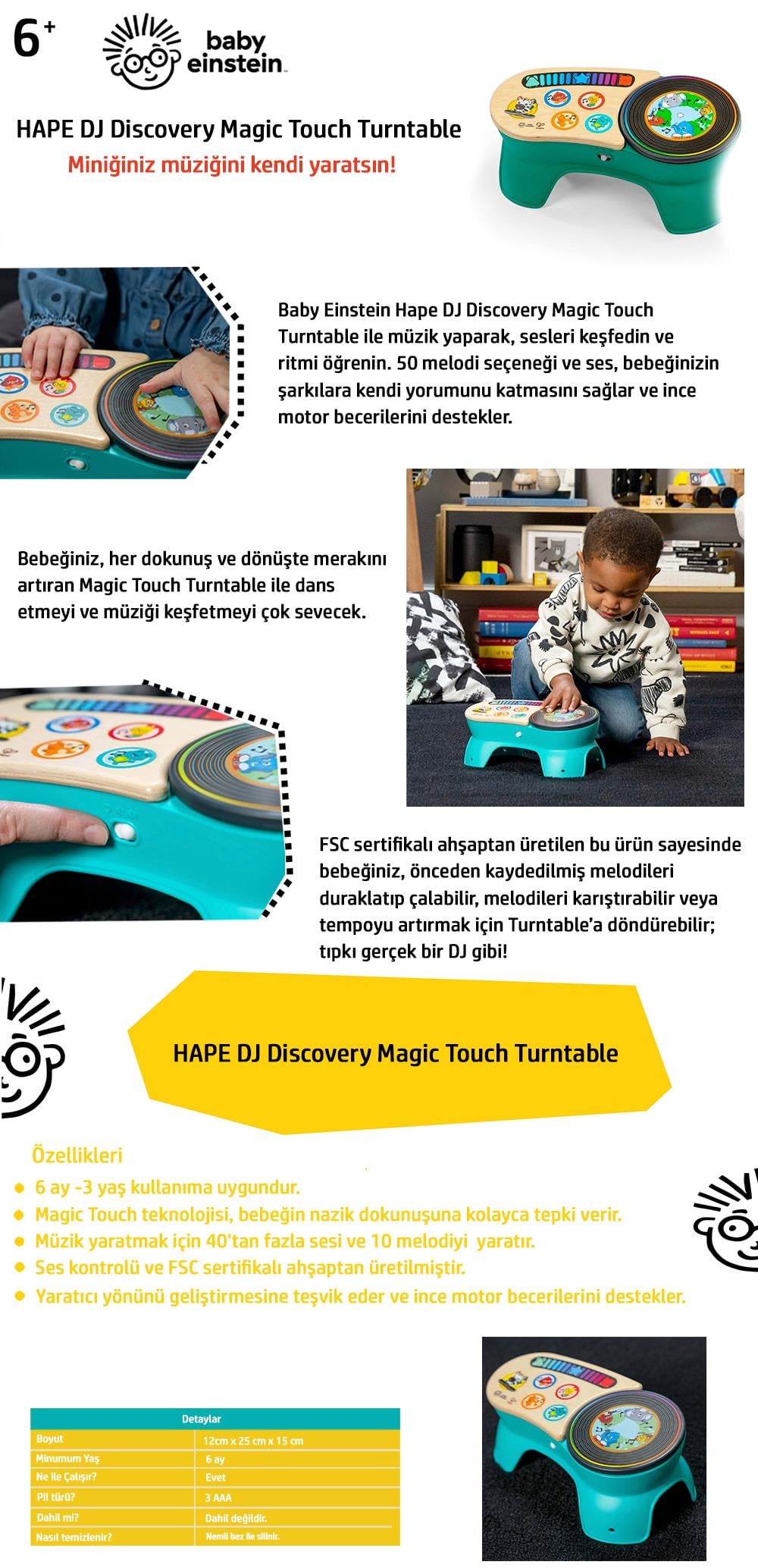 Magic Touch teknolojisi, bebeğinizin kolayca müzik yapmasına yardımcı olur ve neden-sonuç ilişkisini keşfetmesini destekler. FSC sertifikalı ahşaptan üretilen bu ürün sayesinde bebeğiniz, önceden kaydedilmiş melodileri duraklatıp çalabilir, melodileri karıştırabilir veya tempoyu artırmak için Turntable’a döndürebilir; tıpkı gerçek bir DJ gibi!