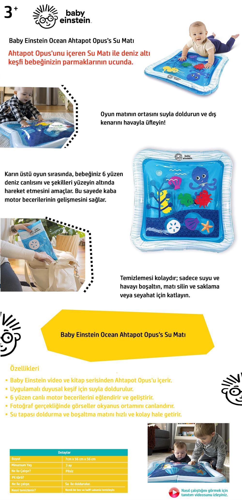Baby Einstein'ın Ahtapot Opus'unu içeren Su Matı ile deniz altı keşfi bebeğinizin parmaklarının ucunda. Oyun matının ortasını suyla doldurun ve dış kenarını havayla üfleyin. Karın üstü oyun sırasında, bebeğiniz 6 yüzen deniz canlısını ve şekilleri yüzeyin altında hareket etmesini amaçlar. Bu sayede kaba motor becerilerinin gelişmesini sağlar. Temizlemesi kolaydır; sadece suyu ve havayı boşaltın, matı silin ve saklama veya seyahat için katlayın.