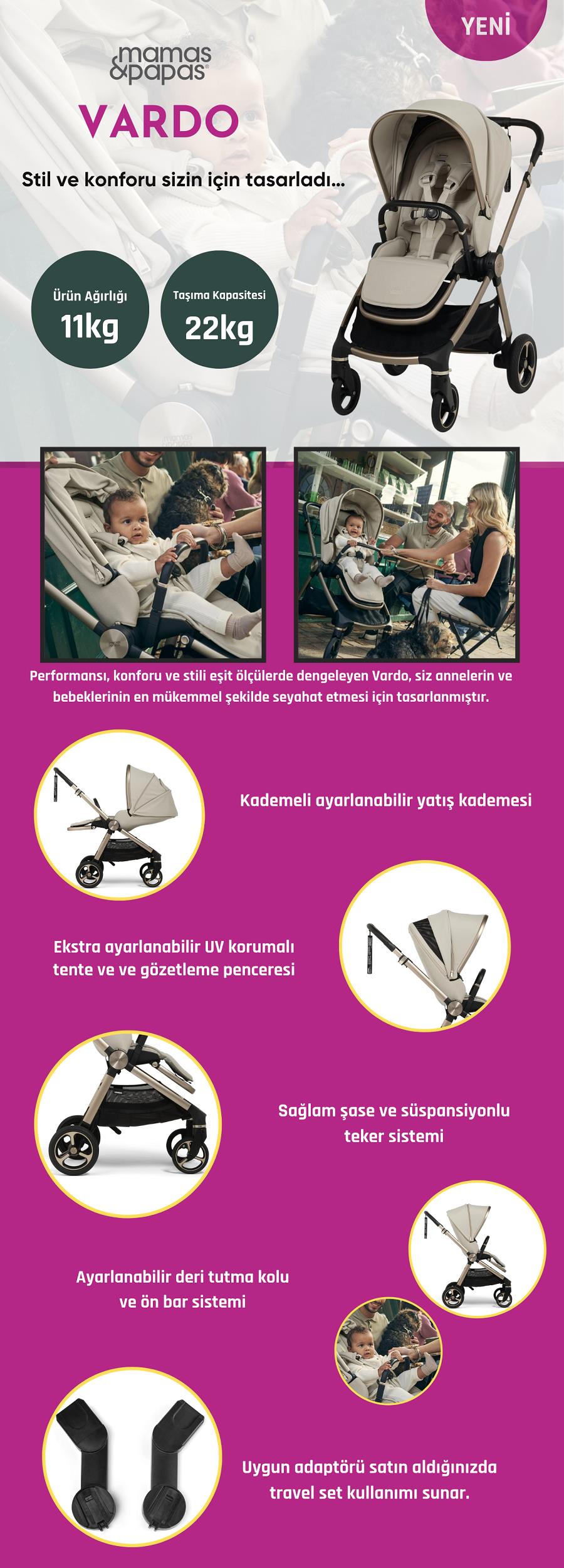 Performansı, konforu ve stili eşit ölçülerde dengeleyen Vardo, siz annelerin ve bebeklerinin en mükemmel şekilde seyahat etmesi için tasarlanmıştır.